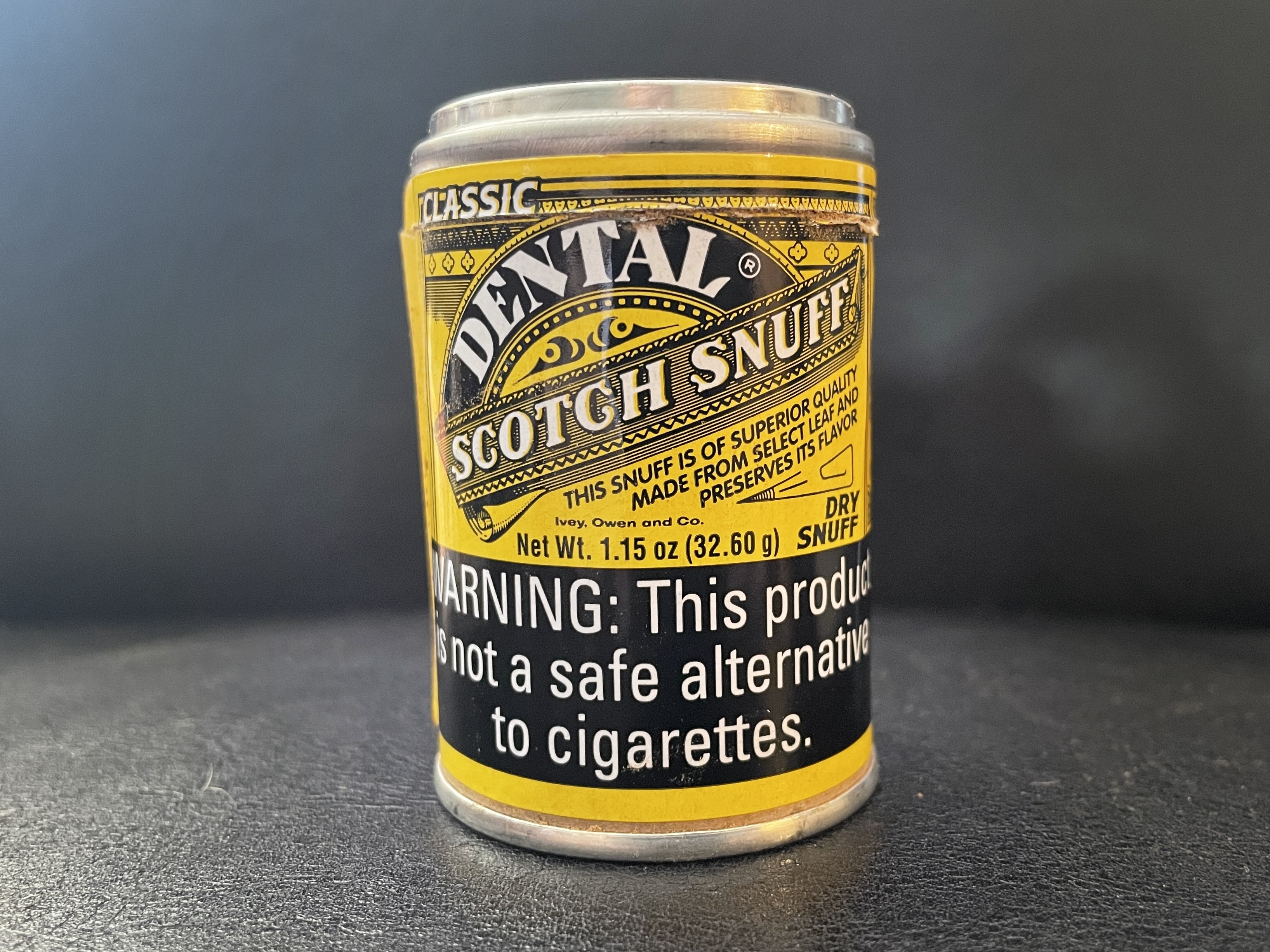 I started using nasal snuff over a decade ago, but I've never really reviewed it until recently. I've always been partial to certain brands, but now that I review it I've been branching out and trying more types of snuff. I've mostly been doing snuff products from Europe but I've had some requests to check out some American stuff, particularly American scotch snuffs. So, today we're talking about an American Snuff Co product: Classic Dental Scotch Snuff! I recently acquired this one, along with some others, from a local tobacco store here in Arkansas. They cost around $15 a can, but they're a little bigger than the European snuff cans, so it about equals out. There's not much info out there about these, but I was able to find a flavor description on MrSnuff.com that describes the taste like so: "This snuff is of superior quality made from select leaf and preserves its flavor". Each container is 1.15oz, or 32.6g (about as much weight as a can of American dip). The side label on the can says it contains 59% US tobacco and 41% imported tobacco.